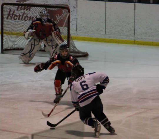 With a full head of steam, #6 Ruff charges into the Saint John zone with the puck